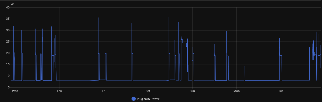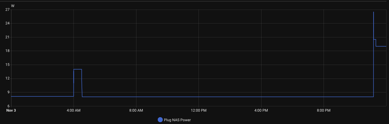 - El consumo normal cuando alguna aplicación lee datos del disco sube a ~20w. En la gráfica se puede ver que al final de la noche, una aplicación prendió los discos.